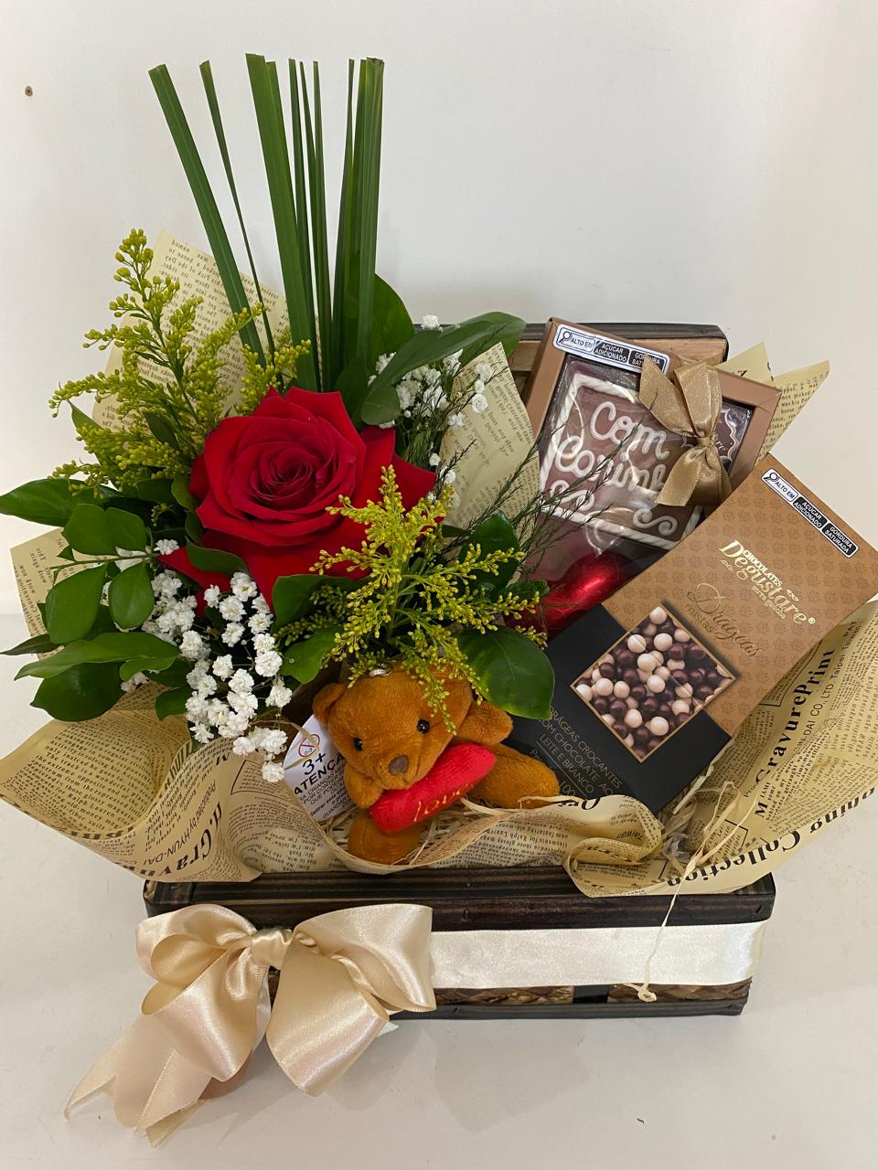 Delícioso Baú com Chocolates variados, mini Urso e arranjo de rosas colombianas!